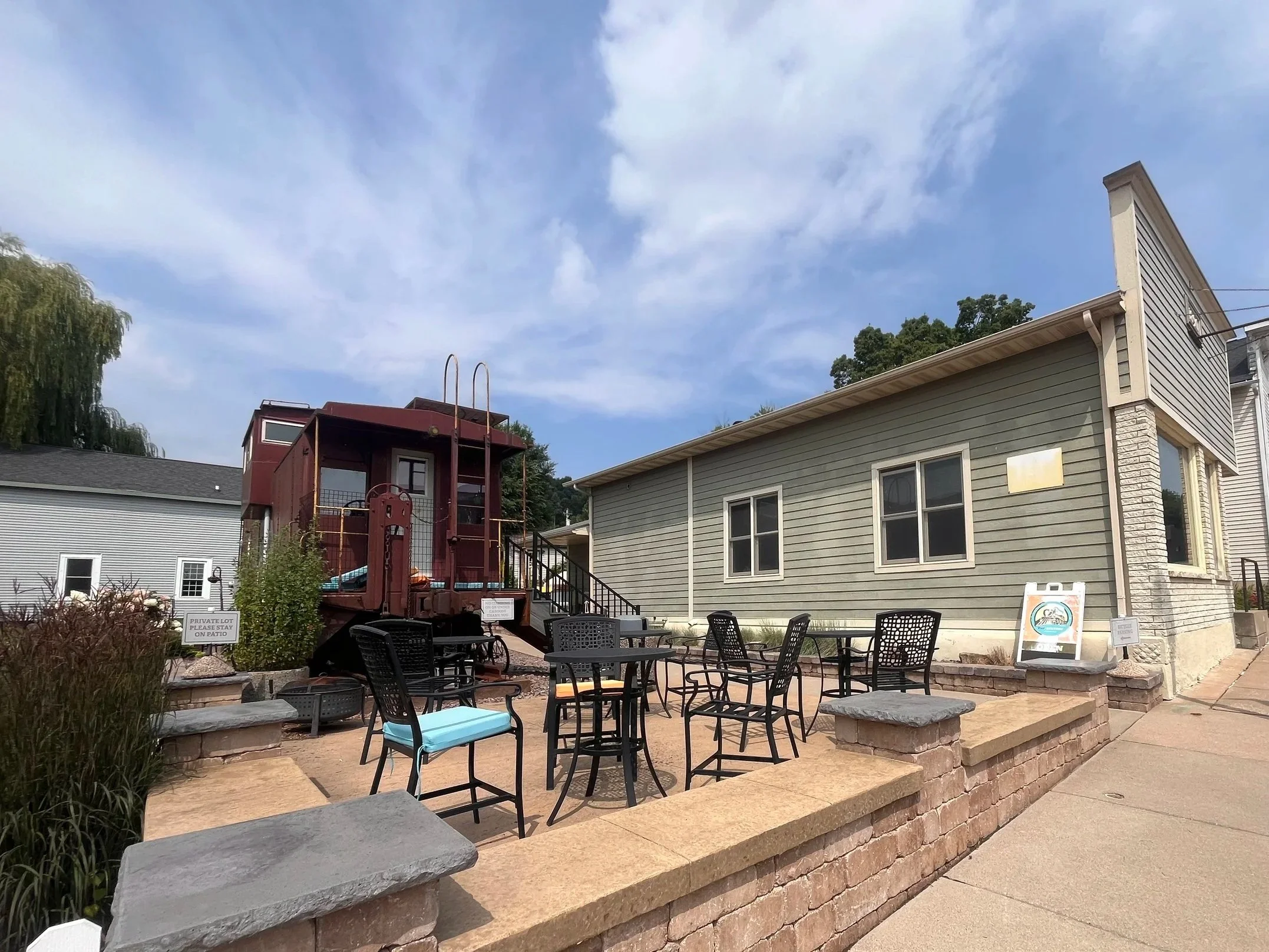 Our space includes a building constructed in 1890, with an art-deco decor inspiration. We have an outdoor patio with seating and a train caboose (currently under construction!).